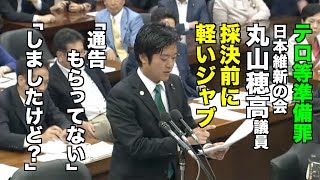 最後の質問に立ったのは日本維新の会・丸山穂高議員。維新の法務委員会の委員は松浪健太議員のはずですが、なぜでしょう? それは、松浪議員が今日は、維新提案の修正案の説明のために、答弁者の側に座ったので、そのピンチヒッターなのだそうです。